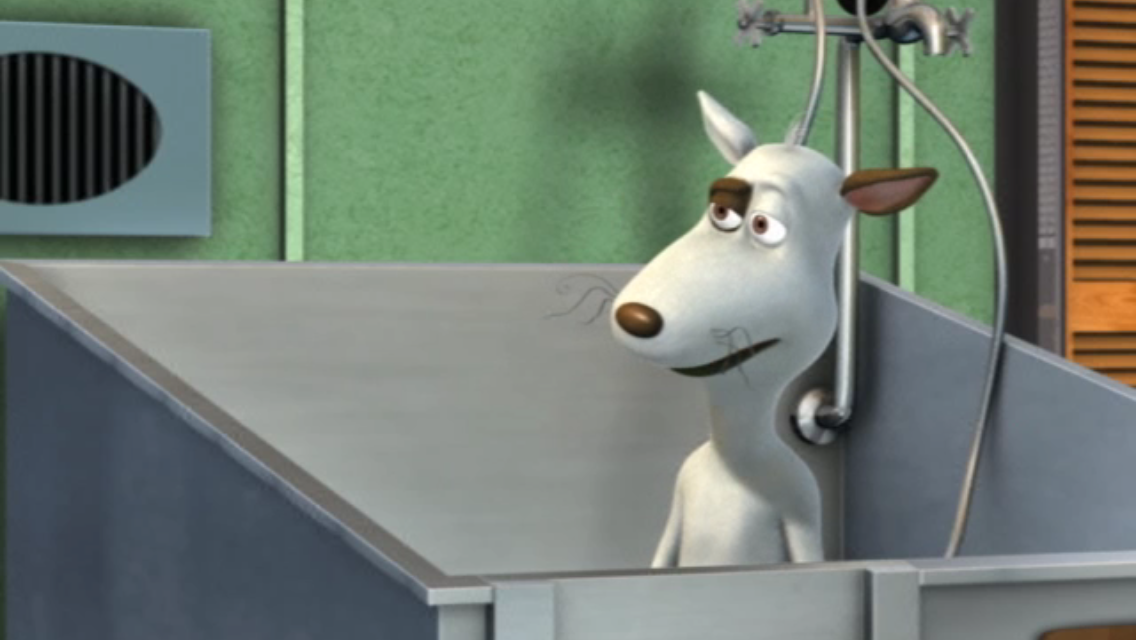 Baxter made his debut in "Doppleganger" at the local animal hospital, switching up orders with Duke, who was in to be given a bath of tomato juice after Skunky sprayed him. Using brown spray paint, he escaped from the hospital unbeknownst to a human disguised Otis and Pig. After Bessy said that she liked the new Duke, Otis is shocked to hear it and says Duke is an imposter in disguise. Only when the real Duke returns from the humiliating treatments after escaping the clinic does Baxter know the jig is up thanks to Skunky, who dislikes Duke.